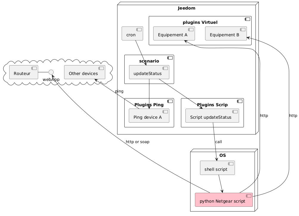 La version http utilise la lib httplib2 pour ouvrir la page device de l’appli web. Le script va ensuite parser la page pour retrouver la liste des équipements connectés https://github.com/chevalir/cabraJeedom/tree/master/script/netgearHttp